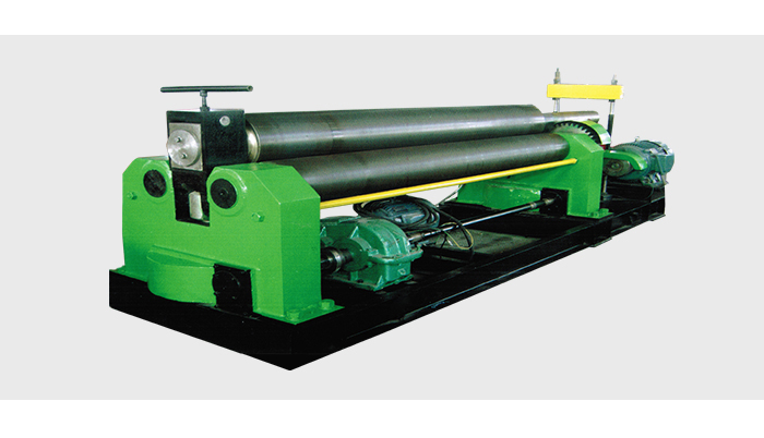 本機結構型式為三輥對稱式,上輥在兩下輥中央對稱位置作垂直升降運動,通過絲杠絲母蝸輪蝸桿傳動而獲得;兩下輥作旋轉運動,通過減速機輸出齒輪與下輥齒輪相嚙合,為卷制板材提供扭矩。本機床結構緊湊,操作維修方便。